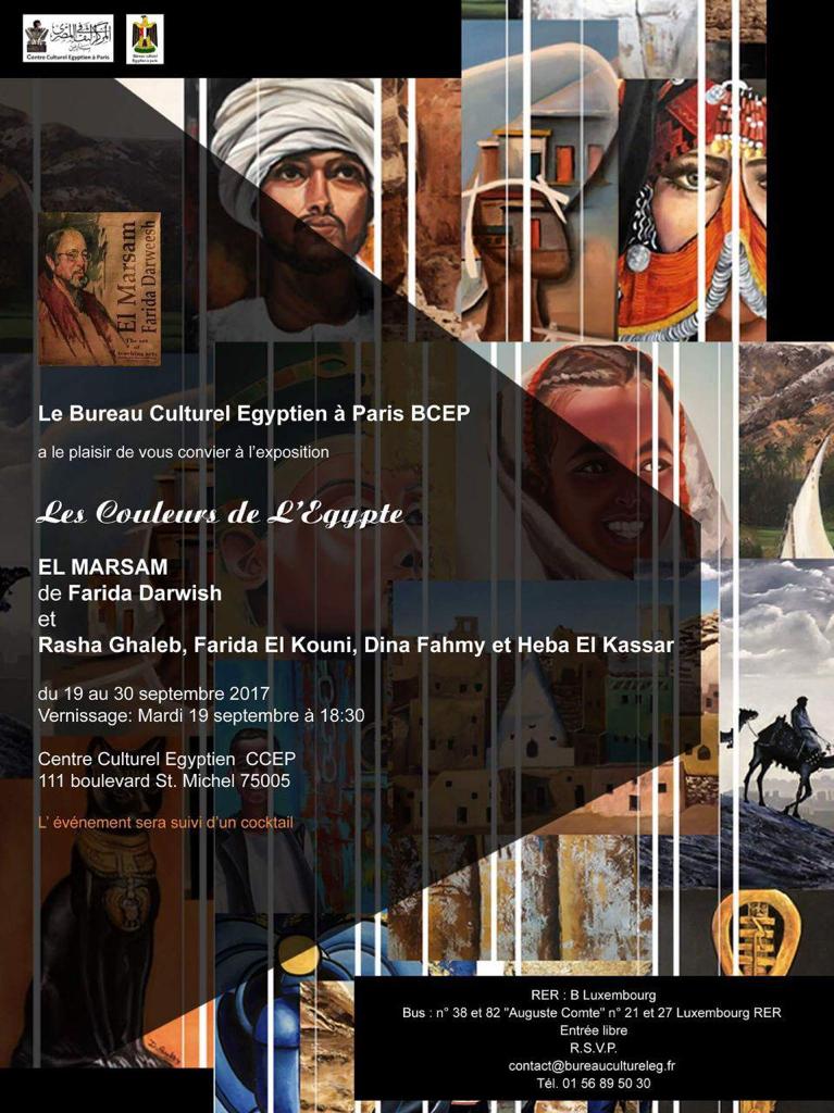 Colours of Egypt 1st International Art Exhibition. The Cultural Office, represented by Dr. Nevine Khaled, the Cultural Counselor, and Dr. Ghada Abdel Bari, the Cultural Attaché, organized an exhibition entitled “Colours of Egypt”, with the participation of Farida Darwish, Rasha Ghalib, Farida El Kouni and Dina Fahmy.Inaugurated by Mrs. Omneya Badawi, wife of H.E. Ihab Badawy, Ambassador of Egypt in France, Minister Plenipotentiary / Hisham Al-Maqoud, Deputy Ambassador and his spouse.